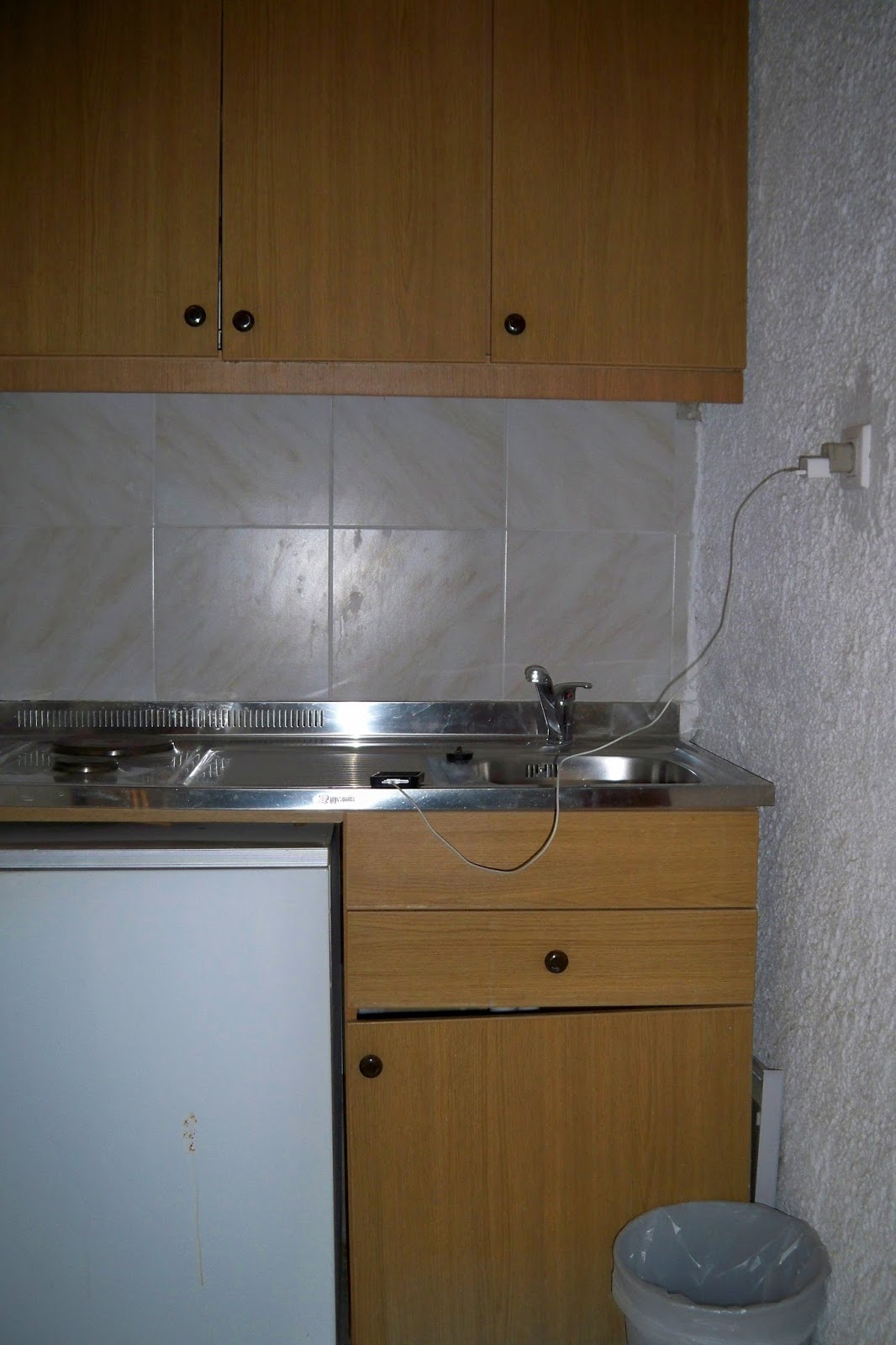 | It also has this little kitchen area where Bob is charging his phone. |